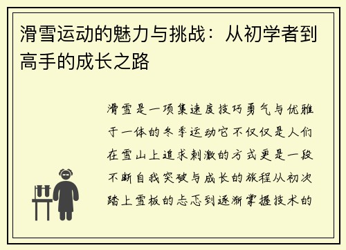 在全球冰雪运动迅猛发展的背景下,滑雪作为一项集运动、休闲、竞技和文化体验于一体的综合性项目,逐渐成为冰雪旅游的核心。本文以“滑雪运动全方位体验与冰雪文化旅游融合发展探索之路”为中心,全面梳理冰雪产业如何在运动体验、文化融合、产业升级与可持续发展等多个层面展开深度融合。首先,文章将从滑雪运动的体验拓展入手,探讨装备创新、场景营造与多样化玩法如何提升参与感与沉浸感;其次,结合冰雪文化的挖掘与传播,阐述...